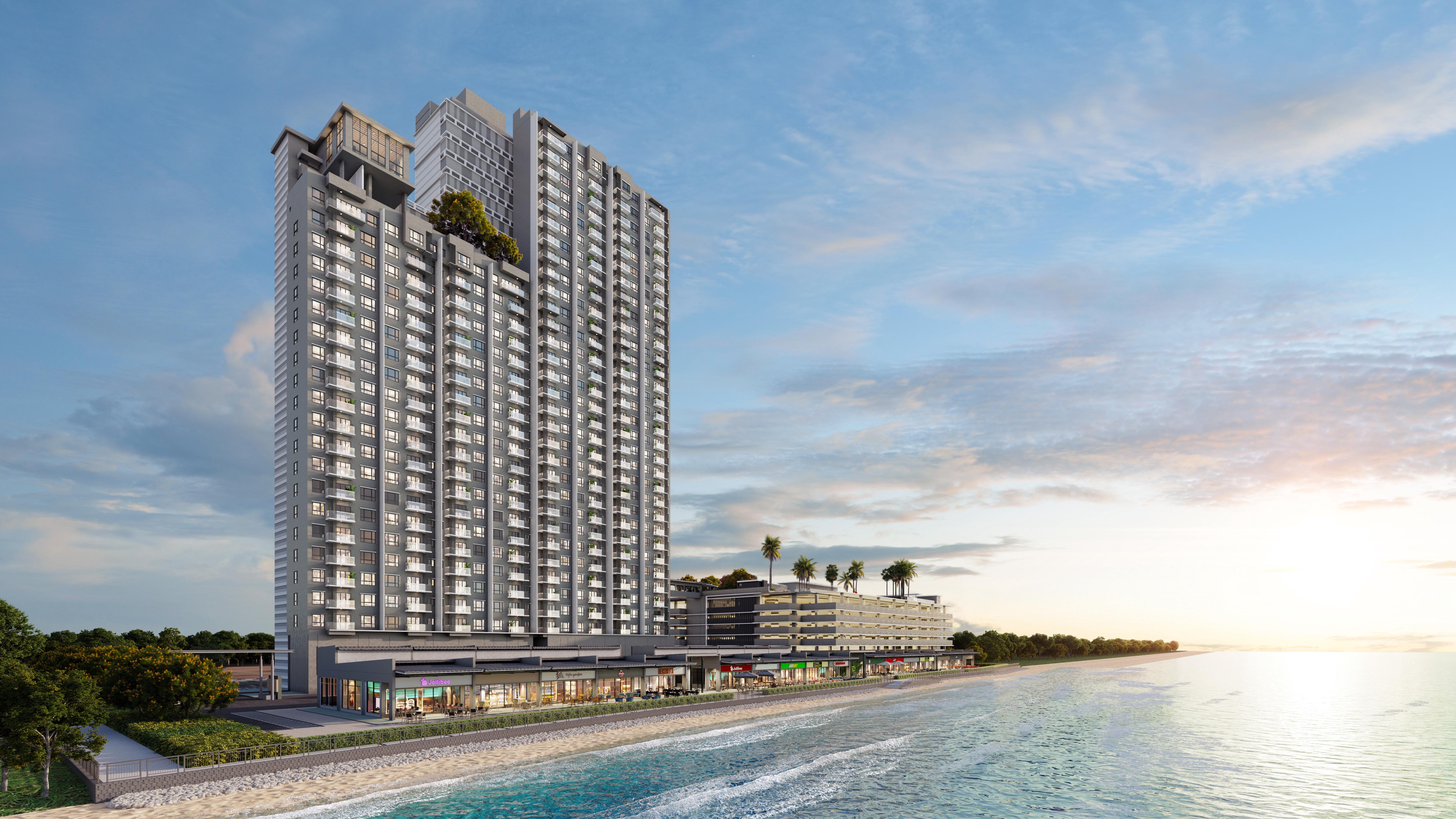 32-storey serviced apartments at Kuantan Waterfront RC. Ocean-leaning palette, podium & sky facilities, orientations toward the South China Sea and Kuantan landmarks.